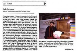 Die als Sinnbild für das musikalische Geschehen dienen. Einzelne Abschnitte einer Komposition werden unterschiedlich koloriert und zu einem „Gemälde » zusammenfügt. Catherine Arnaud arbeitet auch mit Komponisten (u.a. Jean-Yves Bosseur, Thomas Blo<ch, Joe Krencker) zusammen,die für sie Originalkompositionen schreiben, bei denen die graphischen Muster im Vordergrund stehen. Ein Kritiker schrieb einmal: „Bei Catherine Arnaud führt die Musik zum Tanz der Farben… ». Ausserdem befasst sich Frau Arnaud selbst mit der Herstellung von Lochstreifen. Eine ihrer bekannteren Arbeiten trägt den Titel „Variations d’après un thème de J.S. Bach »(Variationen über ein Thema von J.S. Bach). Für ihre Konzerte, Ausstellungen und Performances benutzt sie ein fussgetriebenes Weber Pianola.