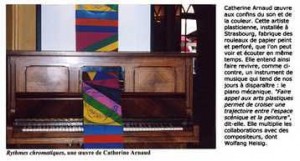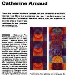 Dans ce nouvel espace ouvert par un collectif d’ artistes, toutes les fins de semaines ou sur rendez-vous,la plasticienne Catherine Arnaud invite tout un chacun à entrer dans l’ univers poétique de ses rythmes chromatiques.Docteur en arts plastiques,auteur d’ une thèse intitulée « variations sur un thème de Bach », Catherine Arnaud s’ est depuis toujours intéressée à la musique abordée par le biais des arts plastiques. Elle a ainsi collaboré avec de nombreux compositeurs tels Jean-Yves Bosseur, Joe Krencker, Esteban Benzecry, Gustavo Beytelmann ou Wolfgang Heisig avec lequel elle prépare un nouveau projet. Ayant rencontré il y a quelques années le peintre argentin Gustavo Rios qui exposait alors à Strasbourg et dont le travail présentait des similitudes avec le sien, elle fut l’ an passé, l’ invitée de L’ Alliance Française de Buenos-Aires. L’ exposition à l’ espace Insight reprend les dix neuf planches peintes sur papier aquarelle et Catherine Arnaud part d’ un rouleau de papier de résentées en Argentine, de même que la vidéo qui permet de sensibiliser la public aux recherches inédites de l’ artiste. piano mécanique de trente mètres de long et de vingt neuf centimètres de large, le rouleau peut déjà être le support d’ une composition musicale et pourra, au sens propre, produire des sons colorés lorsqu’ il se déroulera dans le piano, mais le rouleau peut également être vierge et devenir une partition visuelle qui, à l’ instar des œuvres de Legros ou de Klee génèrera une musique picturale silencieuse.