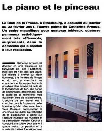 Le travail de la plasticienne prend ensuite une autre direction, plus visuelle encore. Le rouleau est peint Des zones colorées délimitent de la musique. La peinture est réalisée par bombage, avec utilisation de grilles et de caches. Les formes y sont essentiellement géométriques. Dans un second temps,Catherine Arnaud a produit des supports peints : quatorze planches mesurant chacune 29 mètres de large et un mètre de haut,quatorze planche de la partition de départ .C’ est cet ensemble qui est présenté au Club de la Presse. Le support est en papier aquarelle et l’ artiste y a utilisé comme pour le rouleau entier le bombage mais aussi de la couleur acrylique, appliquée au pinceau.La création de chaque panneau est spontanée et sa réalisation est conduite par l’écoute de la partition. Les fonds sont réalisés d’une ou plusieurs couleurs, ainsi que les motifs et les dessins des perforations. L’ensemble fait penser à un travail de vitrail, composé d’éléments géométriques. Pas de figuration, ici le langage est celui de l’abstraction, et on comprend à quel point « le rythme s’exprime bien dans la forme géométrique ». L’artiste les appelle des «fragments sonores statique », « des événements sonores». Si la musique peut être qualifiée de dynamique, la peinture de par son immobilité, serait alors statique. Les références de Catherine Arnaud sont situées à divers pôles : Bauhaus, abstraction, néo-plasticisme. Elle cite Kandinsky, Klee, Klimt pour sa représentation de la «frise Beethoven», Schoenberg, musicien et peintre, ou encore John Cage et ses «pianos préparés». On a pu apprécier son travail et entendre la partition en mai 1998 à l’Aubette. avec Joe Krencker à la contrebasse, lors du festival Ima-Jazz. La production actuelle a été présentée pour la première fois à Colmar en octobre 2000. Un enregistrement filmé Roll Over Performance» y a été réalisé, par la télévision locale de Biesheim. Cet enregistrement était visible durant la durée de l’ exposition