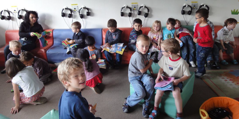 D’abord nous sommes allés à la médiathèque, il y avait beaucoup de livres, des CD et des DVD. La maitresse nous en a lu et on en a regardé : des grands, des petits, en papier, en tissu, en plastique.